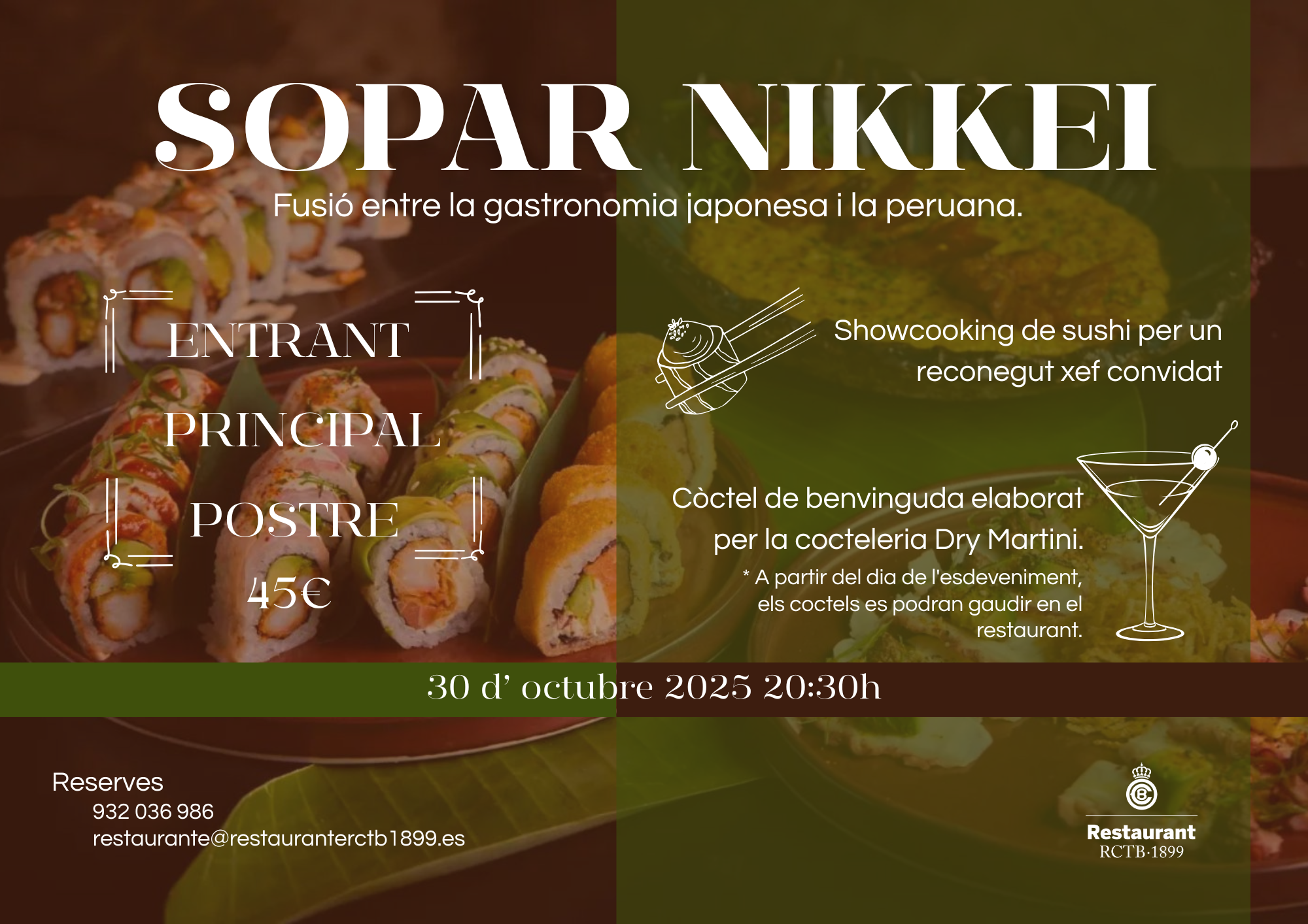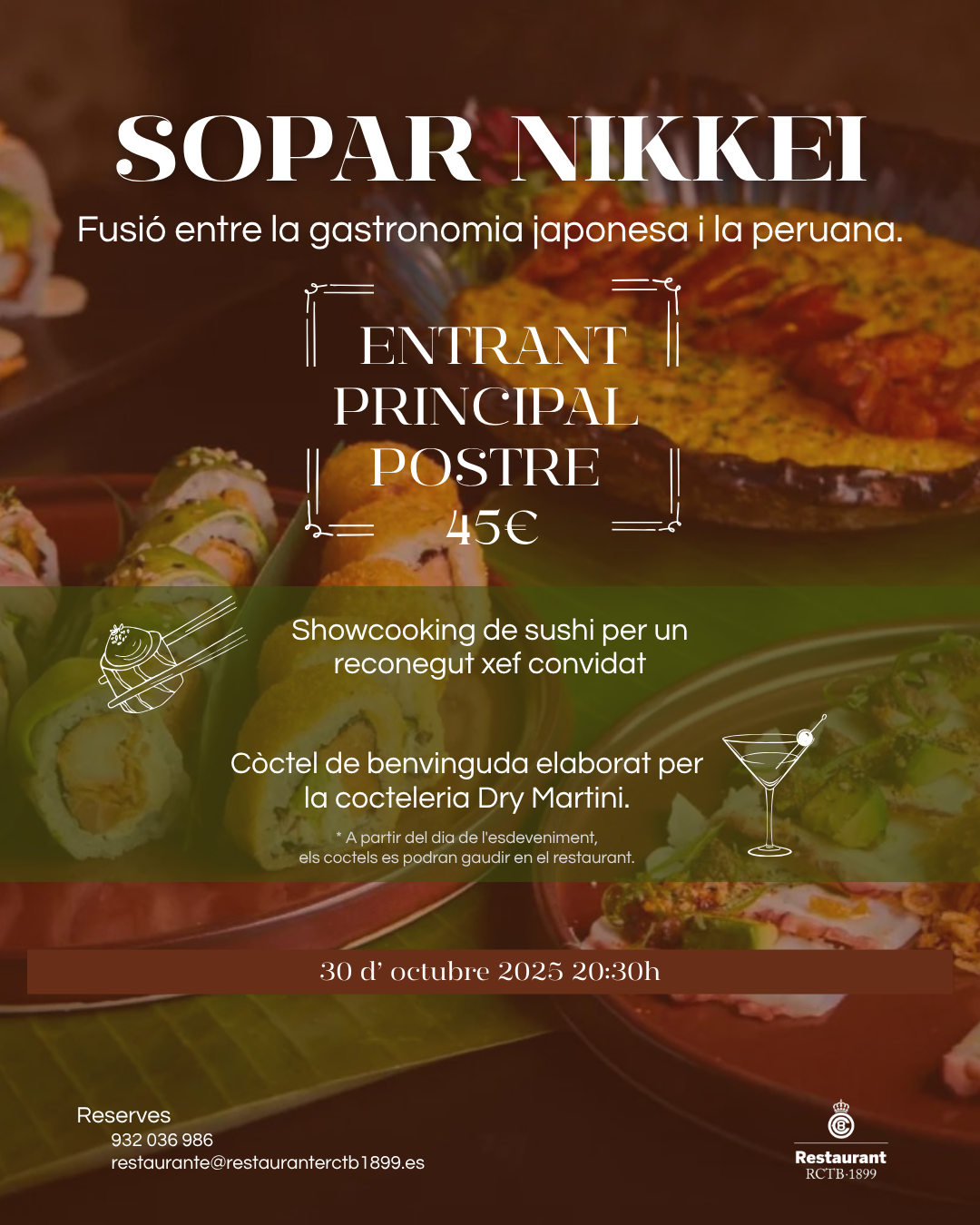 Els socis/es de l'RCTB-1899 i acompanyants poden gaudir d'una altra vetllada gastronòmica (30 d'octubre) organitzada pel Restaurant del Club: Sopar Nikkei. Serà una fusió entre la gastronomia japonesa i la peruana amb entrants, plat principal i postres. Hi haurà un showcooking de sushi a càrrec d'un reconegut xef convidat.