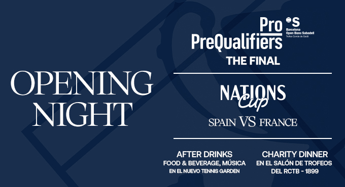 L'Opening Night reunirà dos grans esdeveniments que reflecteixen l'esperit més solidari del torneig: la Nations Cup, un partit amb reconeguts exjugadors (Espanya – França), i el Sopar Solidari de la Fundació Tennis Barcelona, una trobada benèfica que reunirà representants del món esportiu, institucional i empresarial. Prèviament, també tindrà lloc la Final de la Pro Pre-Qualifiers.