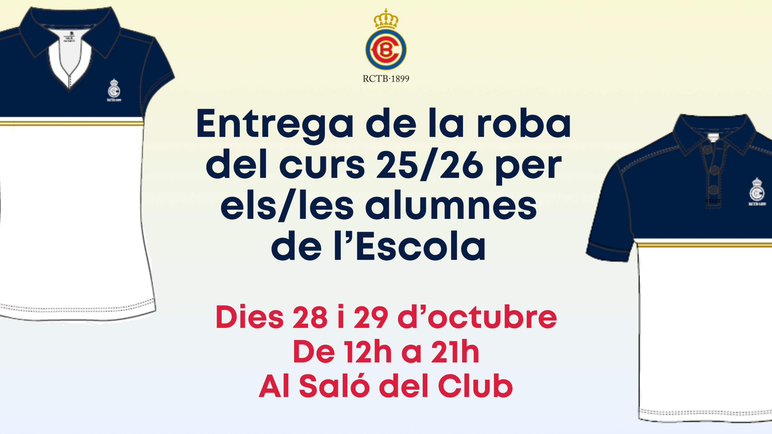 L'RCTB-1899 organitza dues jornades especials per repartir la roba Austral de tots els alumnes del club inscrits a l'Escola de Tennis i Pàdel del curs 2025-2026. Durant el dimarts 28 i el dimecres 29 d'octubre, de 12h a 21h, s'entregaran les equipacions al Saló del Club.