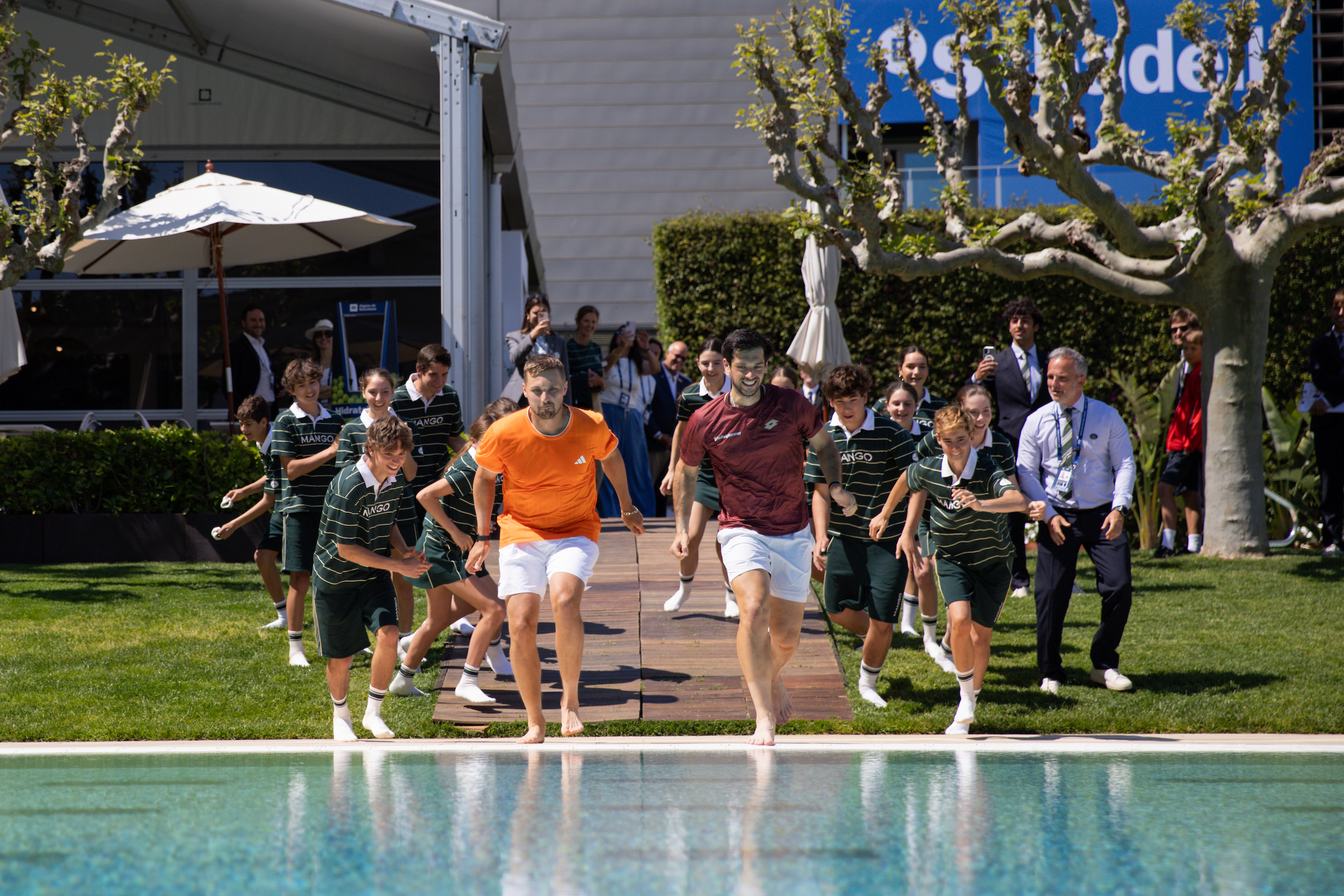 Tras la entrega de trofeos, la pareja campeona cumplió con el tradicional baño de campeones en la piscina del Reial Club de Tennis Barcelona-1899 junto a los ballkids.