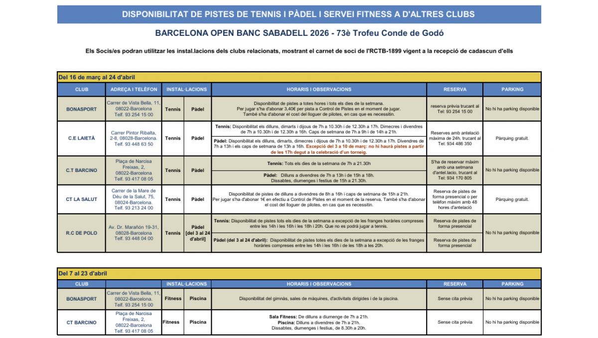 Serveis i horaris disponibles en altres clubs durant el Torneig